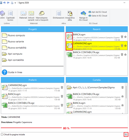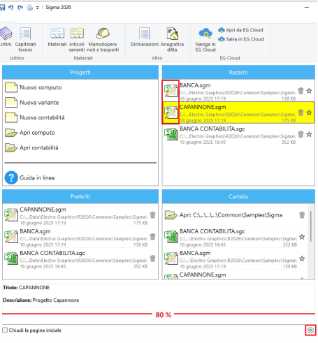 Nell’elenco file dei tre pannelli (Recenti, Preferiti, Cartella), i progetti aperti sono evidenziati dall’icona a matita. Aprire un progetto per tornare alla modalità di progettazione.