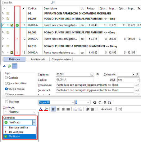 voci, per evidenziare le lavorazioni che devono essere verificate.