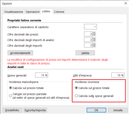 predefinita): l'incidenza percentuale degli oneri di sicurezza è calcolata sul