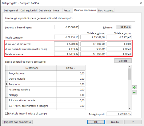 Quadro economico, gli importi di sicurezza calcolati sono suddivisi nelle componenti: