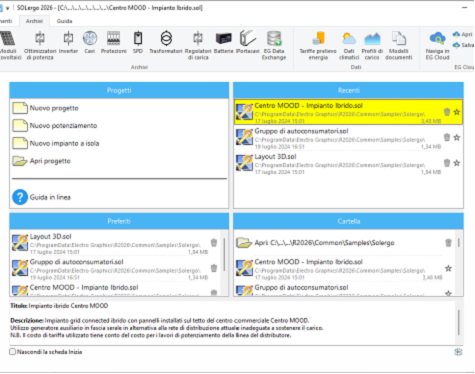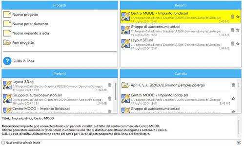 iniziale riporta gli elenchi dei file di progetto suddivisi in Preferiti, Recenti, Cartella.