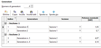 I comandi Elimina, Copia, Incolla in tabella generatori sono disattivati se è attiva l'opzione Unico inverter.