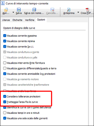 Per visualizzare nei grafici l’effetto delle tolleranze ed il tratteggio delle aree, occorre attivare le corrispondenti opzioni Considera tolleranze protezioni, Tratteggia l’area fra le curve presenti nella scheda Opzioni della finestra Curve di intervento tempo/corrente.