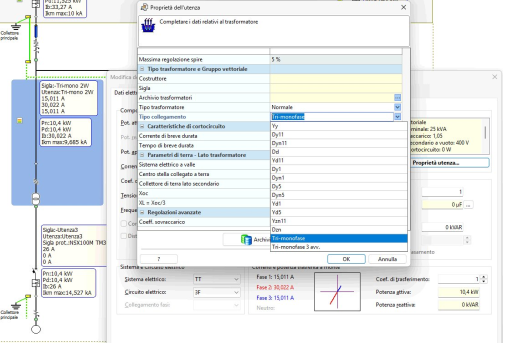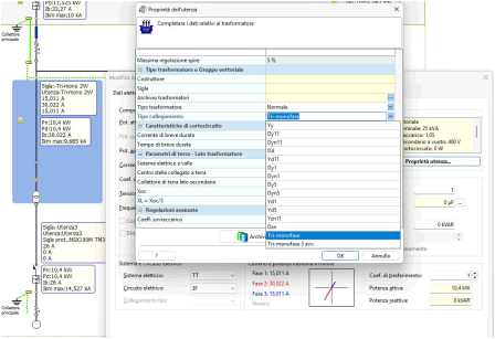Nota. La tensione di riferimento per le utenze monofase collegate a valle del trasformatore viene impostata direttamente nella finestra di modifica dati Proprietà utenza alla voce Tensione secondario nominale.